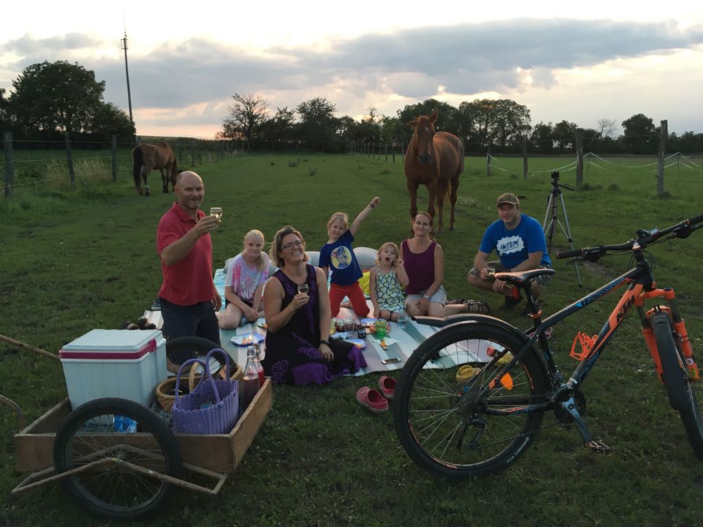 Towards 8 the family gets ready to go up to the field for the picnic. Shouts for pillows, shoes, binoculars, cameras, blankets, food baskets, wine, the tripod are echoed throughout the house – anyone who lives in a large family will be familiar with the chaos of getting out of the house at a designated time. Eventually, all are ready, and we leave from the barn, where two wheelbarrows of picnic material are waiting to be hauled up to the field. Birgit remembers to grab some horse food mix on the way up, so she’s got a bucket in each hand, Charlie a wheelbarrow, one of the son has another wheelbarrow, the other on a go cart, one on a bike; we could easily be mistaken for a family of refugees.