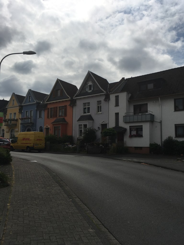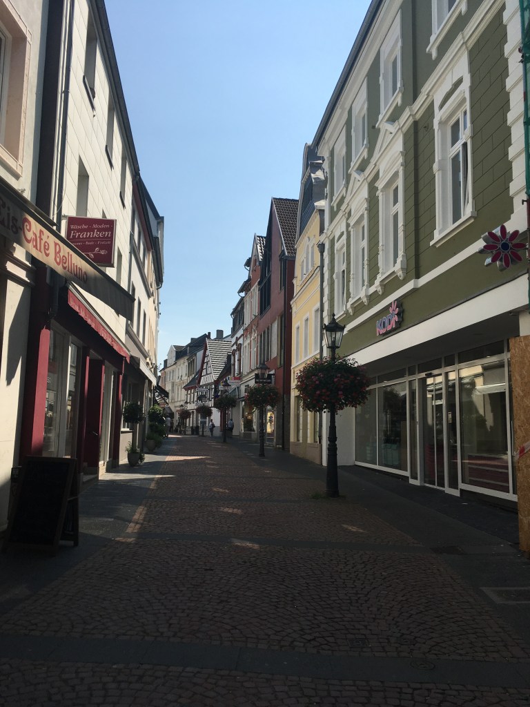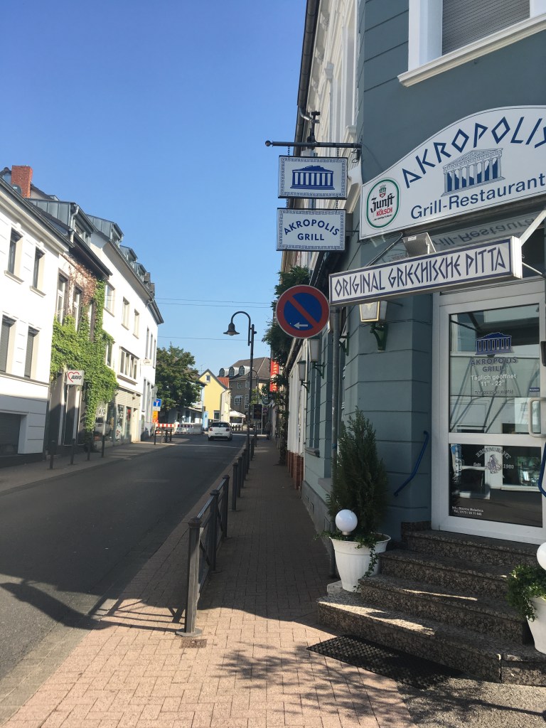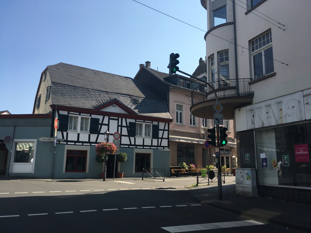 We venture forth, up over the road that bridges over the north/south B42 highway along the Rhine, and into town. The sun beats down already, the heat rises, the light reflects off the stucco houses along Menzenbergerstrasse in strong and sharp angles. We decide to take the first left onto Bahnhofstrasse, deciding to take a tour of the town center first, before going by our house and then up the hill to our accommodations.