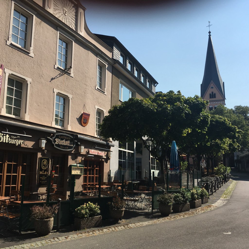Around the corner, and we find an esplanade of restaurants and outdoor cafe tables, something that all towns and cities across the world have latched onto as the evidence of a place that is modern yet quaint, chic yet old world, intellectual and bookish, Parisian and Greek, a place that wants to be visited, returned to, seen by the people walking through, referred to by the people who choose to live here and commute to Bonn or Koln or further every day. If you have outdoor seating in your town, you have earned a place on the map of the world. The Catholic Church is closed for renovations but the restaurants on this Sunday noon are all open and serving despite the heat and the bees, which people seem to accept as part of the privilege of being on the map. Back in the 70s, the opposite prevailed: the church remained open, and the restaurants were all closed. We walk on and around to Kietz, the main square hang out for teenagers, now named or always named Franz-Xaver-Trips Platz, and notice regrettable changes: a metal fence along the short retaining wall we all used to sit on and watch the mofas go by. On the grassy hill now stands a playground, and the cafe tables from the ice dealer on its left spill over and encroach on the area that used to Just be sidewalk.