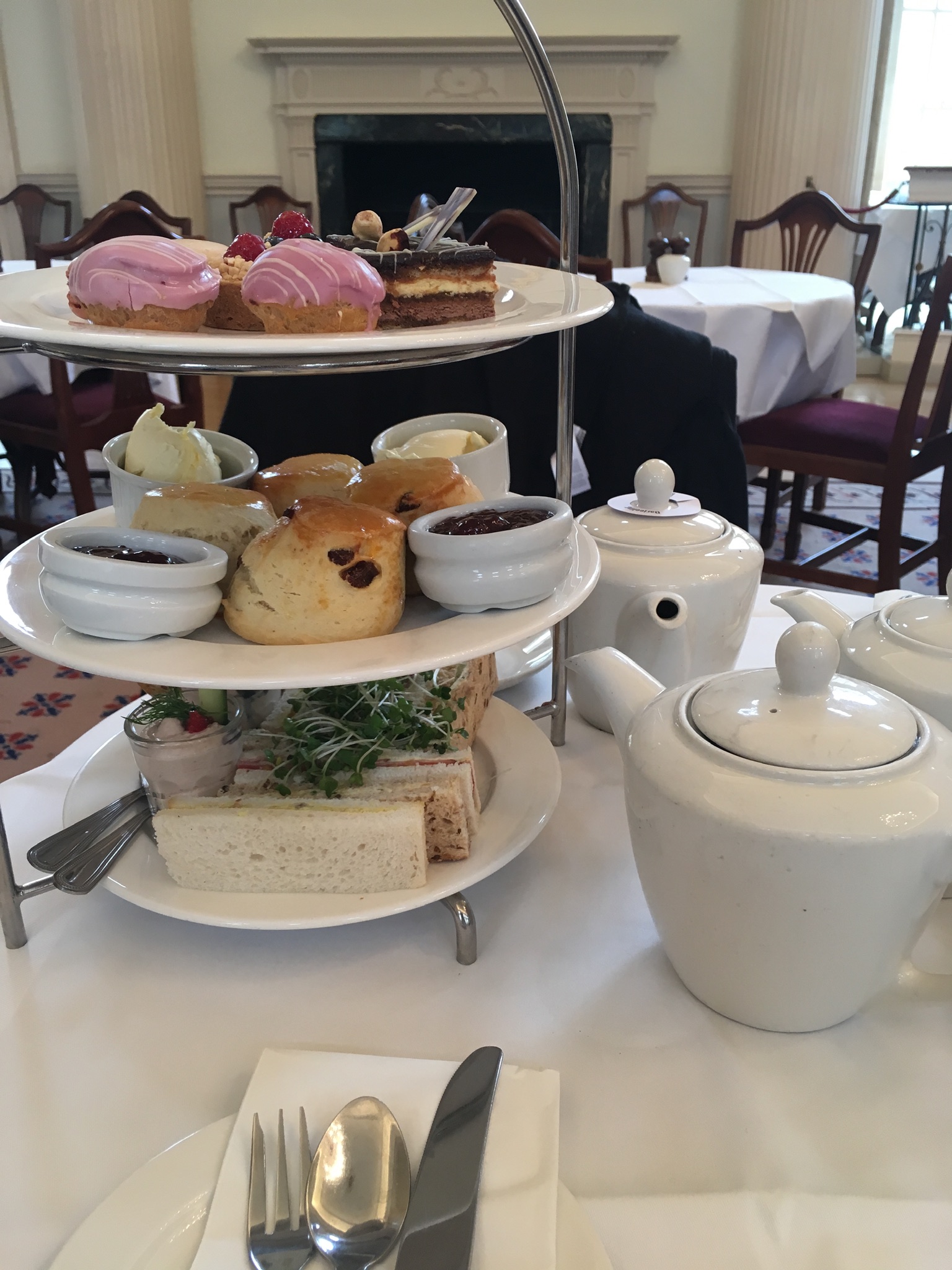 And then with typical English manners, we launched into a proper conversation, bringing each other up to date with events, family, circumstances, and gossip, all the while pausing to listen to the concert, sip on tea, pour some more, and decide on the next bite. In spite of our pacing ourselves, eating slower and slower, and delaying a bit while the trio took a break, by 5 pm we felt the hushed sounds of closing time, and when the musicians packed up and the waitress asked if we needed any more tea, were both silently contemplating to ourselves how to politely take the rest of the goods home. Having no extra baggie in my small day pack, I was left with a rather large heavy duty disposable napkin, which I thought would fit nicely around a few of the sandwiches and maybe the petite desserts, but what about the scone? And the clotted cream and strawberry jam? About this time, L. voiced her own thoughts about how we were going to get this lot home, and searched her bag for a baggie she remembered having packed. Alas, it was only a small wrapper of something or another, and we were left with the napkin trick.