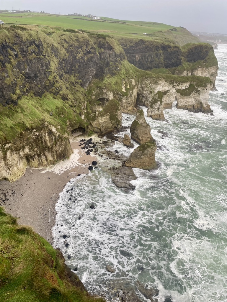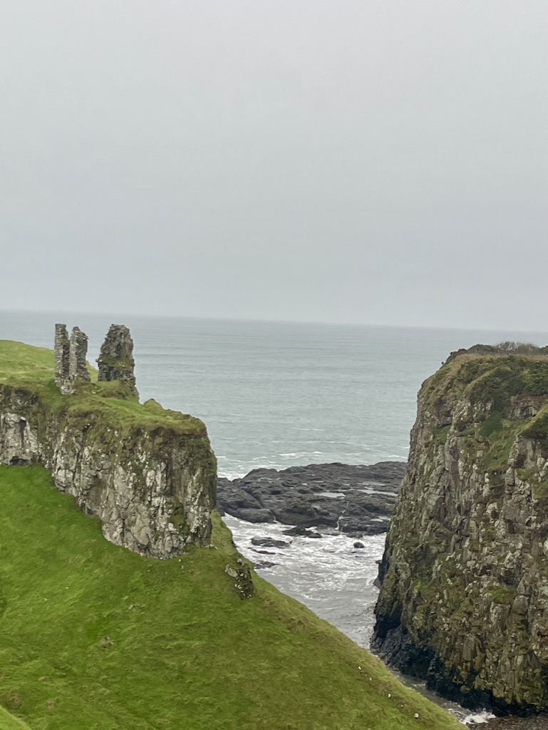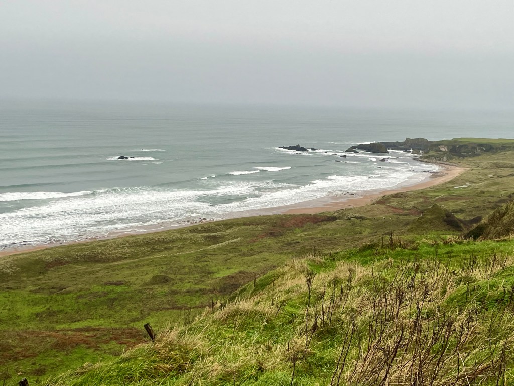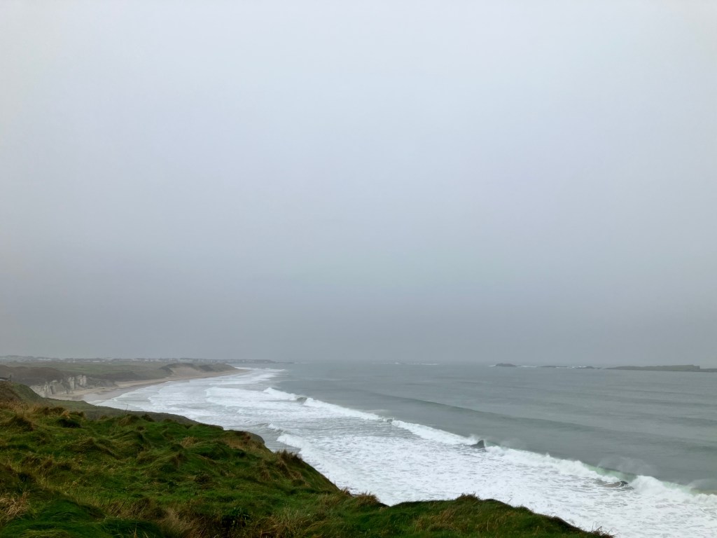 Escaping the more forceful winds and flooding expected in County Donegal, we arrived safely at our cottage, and as the night descended and nothing in the form of gales and floods shook the rafters or hammered the windows, we chalked it up to having blown somewhere else in some other county or blown right over our heads. We woke to a red sky (sailor’s warning?) but a clear morning; we were in luck as we set off to the northeast and across the border for the drive along the highly suggested Coastal Causeway, one of the more breathtaking regions in Northern Ireland that, according to the guide books, must not be missed. We drove through the now familiar fields and villages, fields now shared by both sheep and cows, villages with street signs sharing both Gaelic and English; other villages in English only and flying the Union Jack. We stopped for tea time in Portstewart, at one of the first establishments we found that sat right at water’s edge and the tumultuous North Atlantics waves. It happened to belong to a golf course, which was right next door, and wool vested and capped golfers met their own tee times in full swing despite the gently beginning rain and breeze pick up. The rain came became steady as we veered north to the coast, but inured to it by this time, didn’t pay it much mind, and so didn’t realize how quickly it consumed us until we were somewhat navigationally debilitated by it. The rain and wind pelted the solid rental and sent its windshield wipers into a flapping frenzy; visibility was down to the next corner, whose attention under the circumstances took precedence over the trailheads. Apparently we drove right past the trailhead to Giant’s Causeway that leads under caves and over splendidly cylindrical stones formed by centuries of particular erosion; signs were few and suddenly appeared out of the rain too quickly before we were past them, and the gps had lost all reckoning. Storm Darragh had found us.