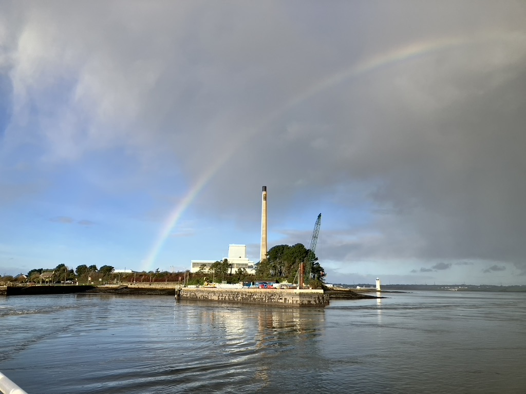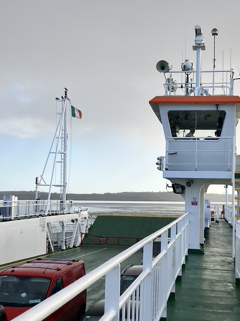 A short half hour later and we were at the Shannon Ferry terminal and waiting for the small boat to take us the twenty minute crossing. We were only 9 cars that day and no walk ons; the overhead clouds were high and so there was little rain, but once on the ferry we sailed through a little cyclone and the rain fell for about three minutes and then moved on, and once again a rainbow appeared over the river. I’ve never seen such full and wide rainbows before this trip; sometimes they seemed so close to us, their wide colored bands falling just behind a nearby crop or in this case right into the water, only meters from us.
