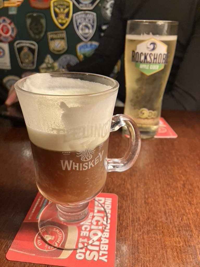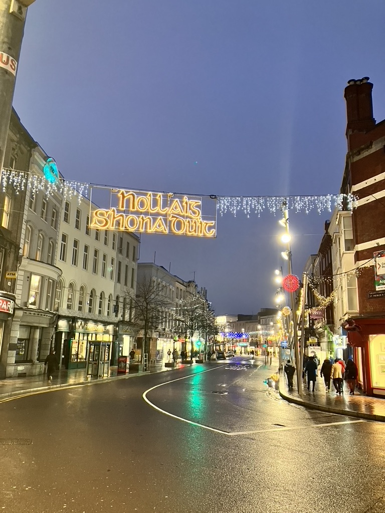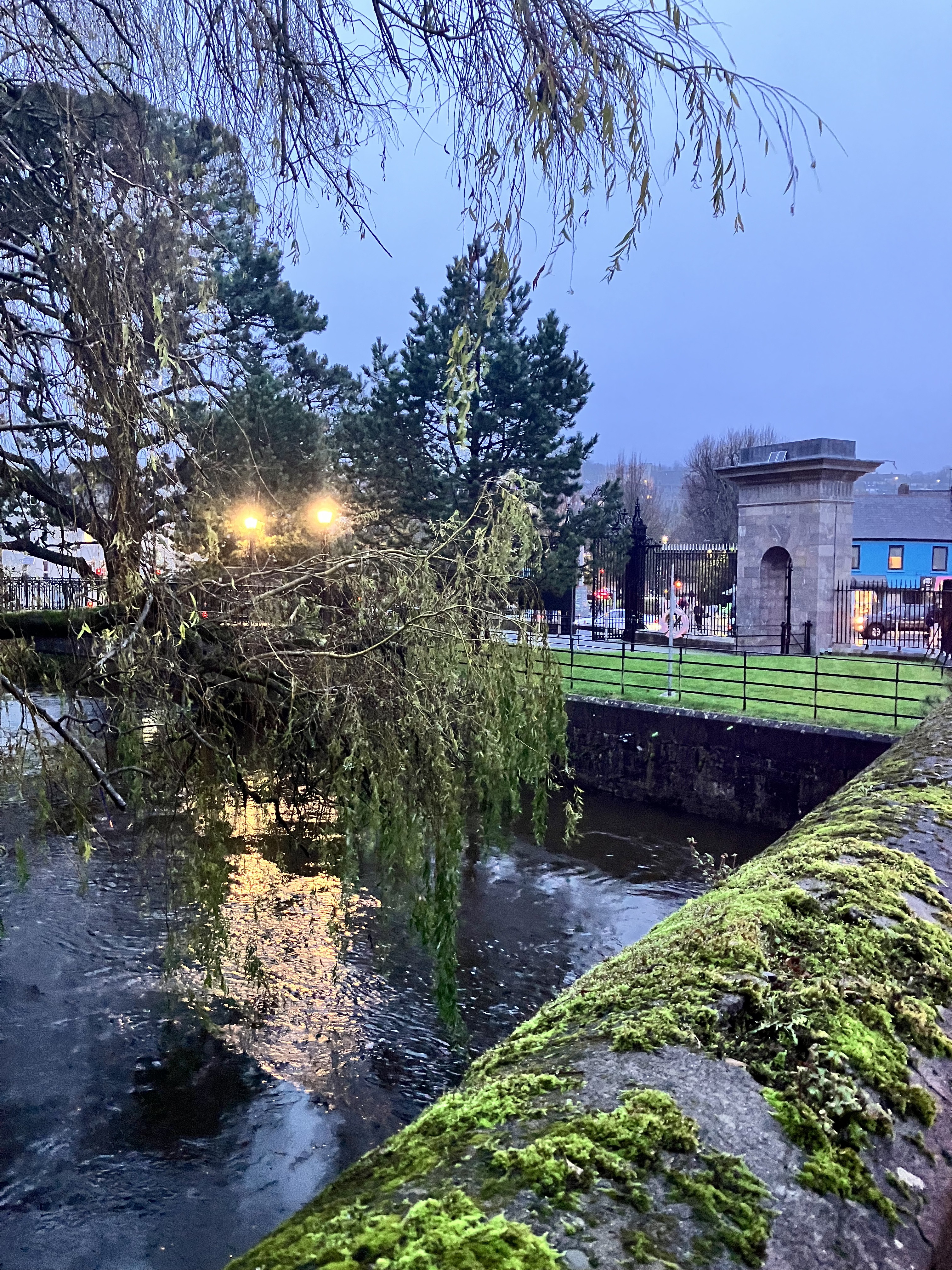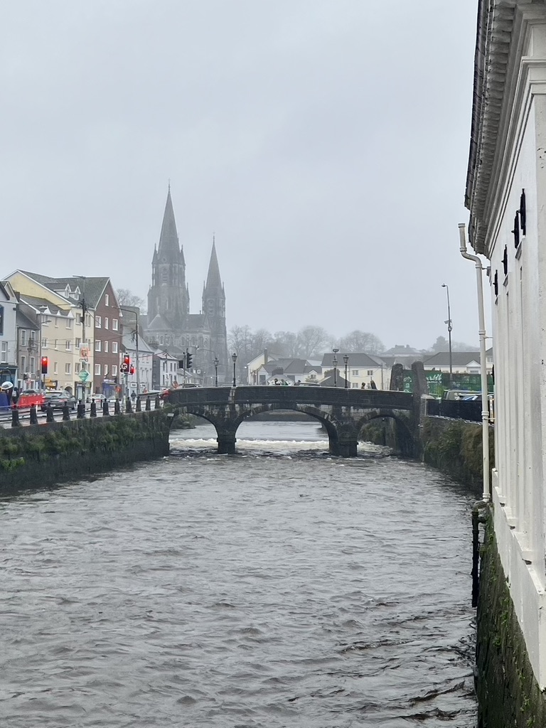 Under a setting sun and a purple-colored sky descending over southern Ireland, we walked back down into the hub of Cork, nestled between the rivers Lee, split into northern and southern tributaries at the east point of the city. On foot today, we enjoyed observing life after dark, that is, after 4 pm, and by this time became familiar with layouts and streets and landmarks; with the purr and groan of both hybrid and diesel engines, the chatter of people along the way, the Irish accents thicker, denser, elongated; the rougher and darker tattooed arms and legs in t-shirts and shorts despite the wind and rain. We stopped for a pint at a local nondescript local bar, sat at the window and watched as the bartender and patrons exited briefly every so often to stand outside and draw cigarette smoke from butts more out of necessity than enjoyment; watched the shoppers, bags hung on folded arms, one clutching their coat lapels against the rain, the other holding onto a sturdy umbrella; the young walking in groups, laughing and chatting and smoking into it, never a bother.