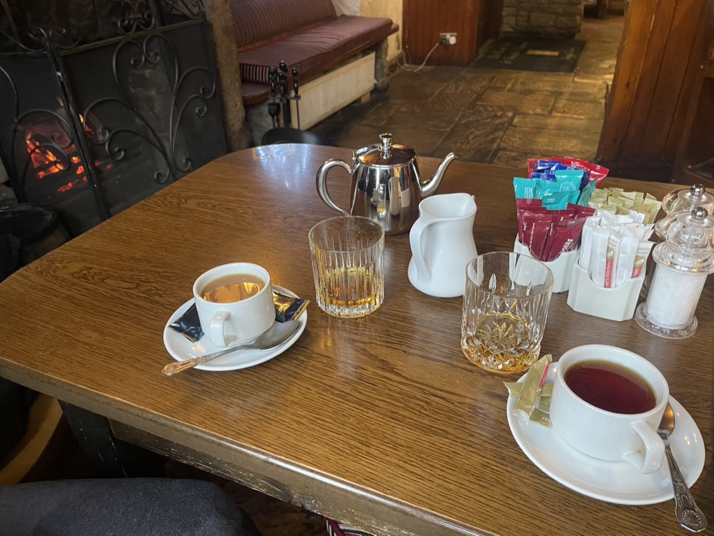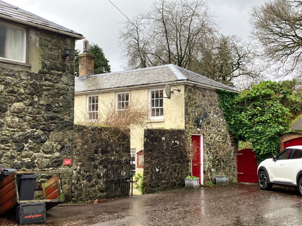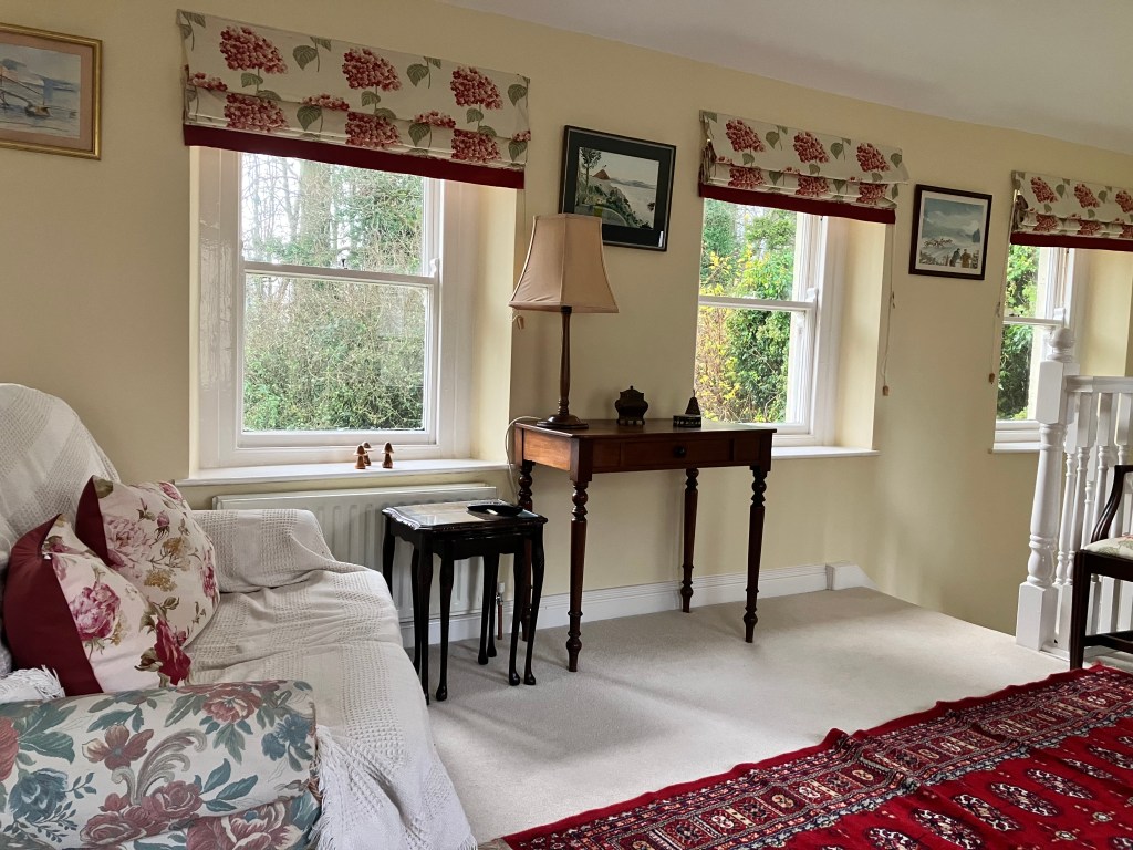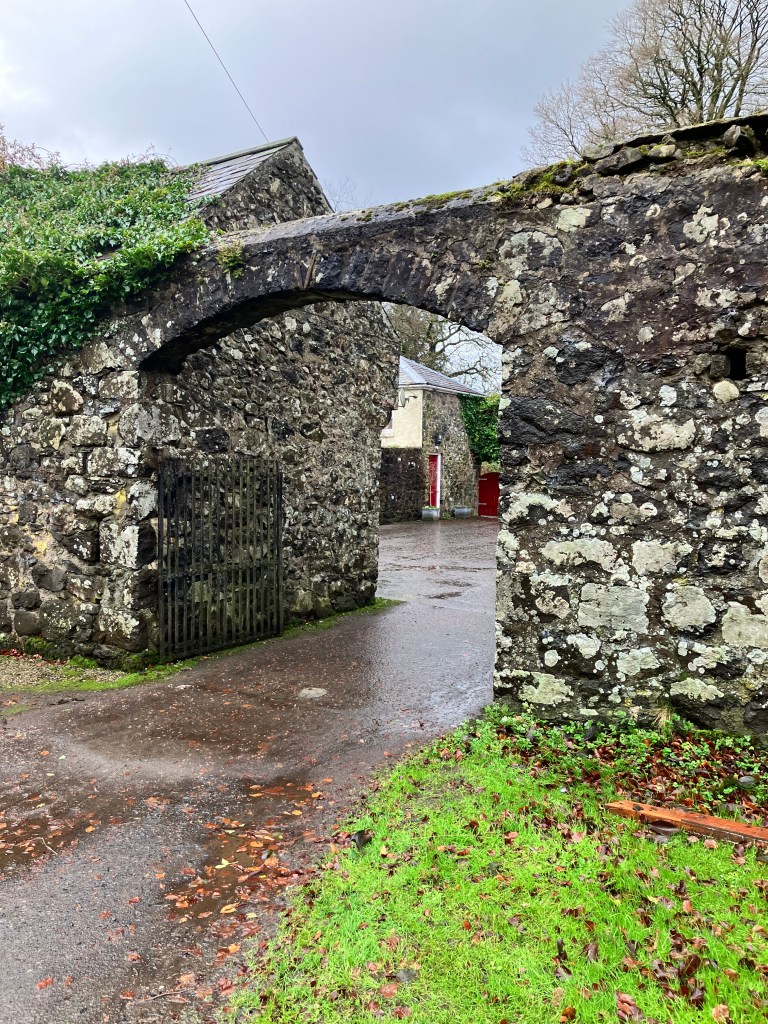 Waiting out the storm did not appear a likely option. We drove south from the coast, towards Ballymena and the accommodations waiting for us. We picked up a signal somewhere along the road and directed our sights through the rain and several roundabouts later, came through the property gates flooded not with water but with stage lights, the lights of a production company. Richard, the owner, came out to greet us in rain gear and umbrella, and told us the grounds were being used for a BBC drama series set and they were just wrapping up. We could see why the location was ideal: We entered a courtyard around which a main house, barns and stables were built all out of stone, and whose wooden doors were all painted in brilliant red. Inside, and a few steps down to a large kitchen with a heated floor, a tea kettle and a small electric radio on which I found several channels of BBC news and music. Upstairs, a living room, upholstered in rose flowers, cloth shades in like patterns, and old glass windows that rippled slightly to views of the wild garden below.