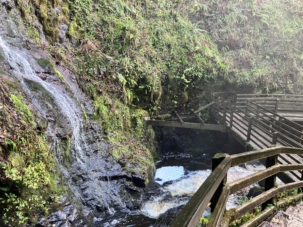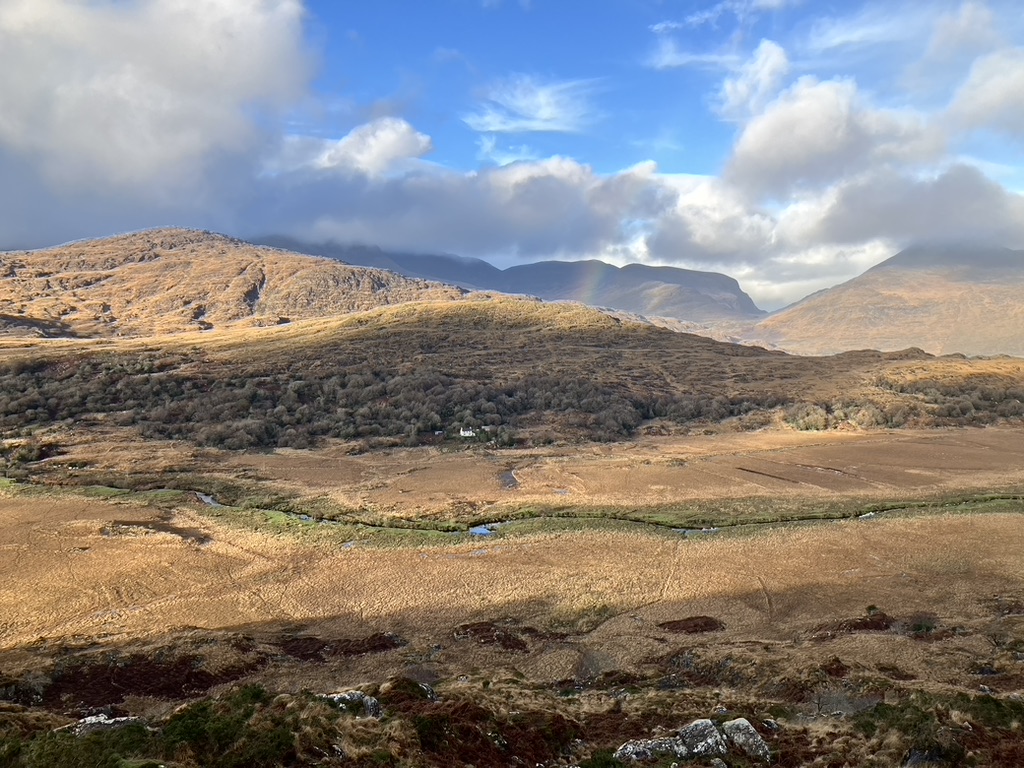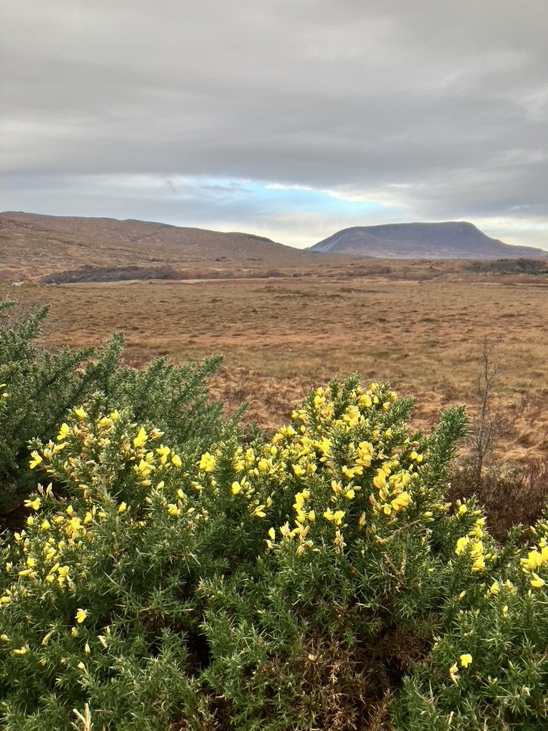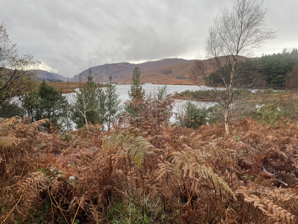 Glenveagh National Park was our second day destination, a short drive to the north central part of the county. It has hiking trails along its major lake, Lough Veagh, and a few that extend perpendicular to it; one that leads to an estate castle that has seen its change of ownership since it was built. We were introduced to its history with information in the reception hall. Its first builder and owner, was ruthless Anglo Irish John Adair who created animosity between himself and the neighboring farmers by requiring them to pay a tax, and soon evicted a significant farming population when relationships became too tenuous; at one point one of the castle tax collectors was found murdered in the hills. But he died one day, coming back from the US on business, and his wife took over the property, bringing a sense of restoration to the gardens, grounds and relationships. Upon her death, it lay abandoned for some years before an Arthur Porter, archeologist from Harvard University moved in to study Irish culture. Unfortunately, he disappeared one day when he was off exploring the Inishowen peninsula, just up the road. The last owner was a Henry Macllhenny of Philadelphia, whose roots and ancestry originated not too far north, in Donegal, and he came home to roost and cultivate the gardens, until 1975, when he sold it to the Office of Public Works, which created it and the surrounding acres into a national park. “Feel free to wander,” the receptionist told us, “But there is a storm coming around 3.” From the recent wind and rain activity we’ve experienced in these past days, we weren’t quite sure what a storm might entail. “Heavy heavy wind, lots of rain, and flooding in areas.” We checked the time; we looked to the sky; we consulted the map of yet undiscovered nature trails, and felt we needed to make adjustments in light of the threat. As we returned to the car park along the scenic level trail along the lake, the wind picked up and the clouds out west were getting dark. It seemed to be a normal day in Ireland’s wee daylight. The surrounding mountains have soft tops and and its once bright colors have gently folded up for the winter in faded greens and browns, mellow and patient for the solstice.
