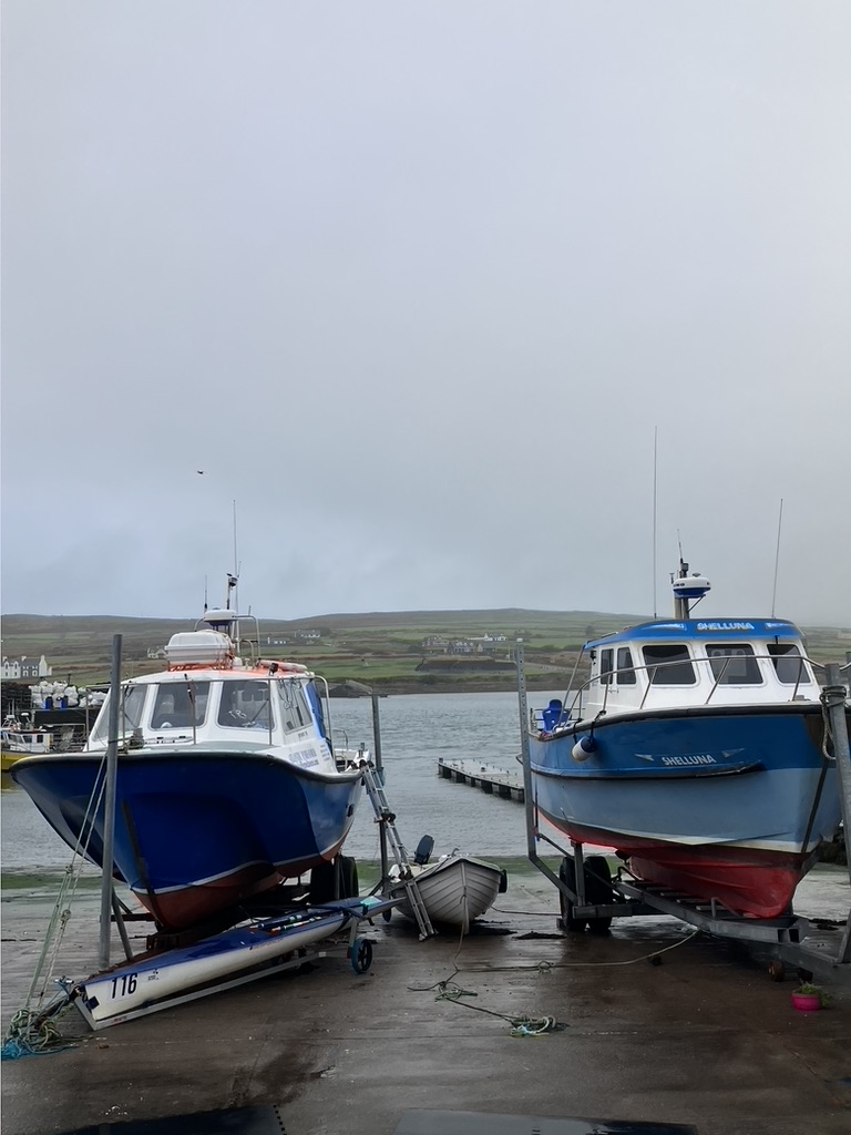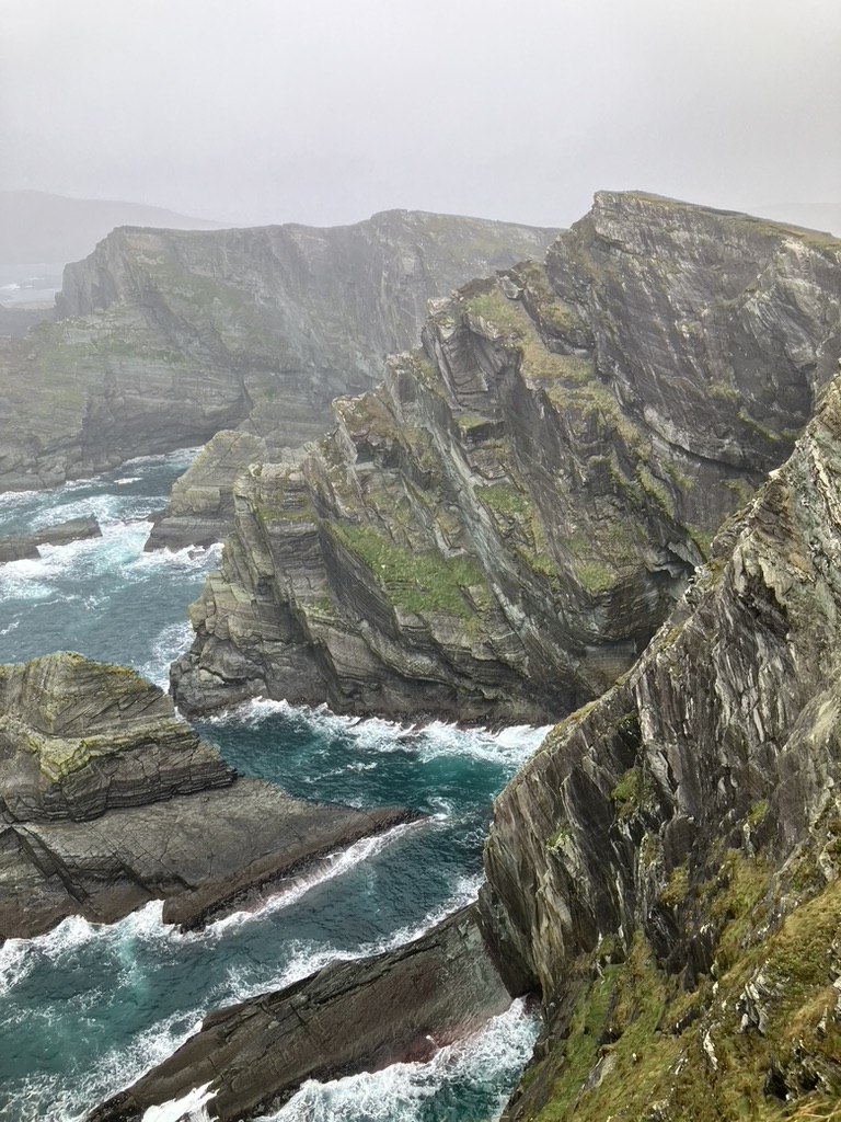 Strong coffee in Portmagee to wake from this meditation; the fishing boats tethered like hunting dogs to their kennels, waiting and pitching, waiting and waiting the dark nights out. We continue along he narrow road winding around and over fertile sheep cropped tufts and hills plotted with slate and limestone rock slices stacked on each other so long ago, still standing. My heart is heavy, full, fed from unmarked ways that bring us to our destinations: the washing from the rain, the sharply wind eroded edges we face, wild waters we are carried away by and currents on which we return.