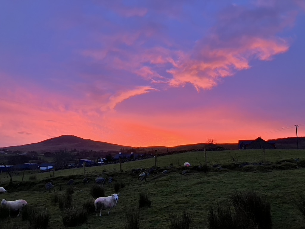 The kitchen faces east, and that next morning, still under a clear black sky, the horizon bled red. For several minutes the color held fast, like tempura paint. Then ever so gradually, the red leaked into orange and pink, giving way to a purple sky, as if a painter held a spray bottle to it and moistened his canvas with ocean water. A sheep slowly walks into this tableau, nibbling at the new overnight sprouts, looks up, and our eyes meet. A thick, dirty white wool covers its husky frame, not a shiver or complaint rippling through its fat and muscle. It lowers its head, moves on, uninterested in my musings from this Theatron seat in soft light and electric kettles. I feel as if I’m part of an audience to an ancient play. Gradually, the skene, the backdrop, introduced a bank of thick clouds, arriving as if hitched to and pulled by the sun, leading them to rest over this island nation.