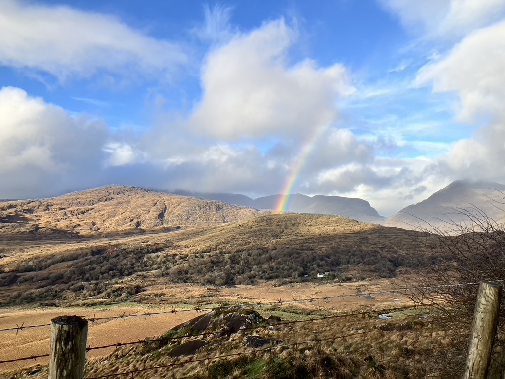 Kerry opened the skies for us, and we rolled into the county of stone demarcated farmland, fields nibbled to the quick, so that everywhere was a canvas of green and white polkadots. The sun peeked through cloud breaks and over their linings, and as dim and timid as it was, as much as it wanted to stay near the horizon and venture not so high, the sun still cast a golden yellow over the hills and onto the green Kerrygold fields. The wind on this day kept every element moving along; and on our way to Dingle Peninsula we met up with soft intermittent rain, quick and resplendent sun bursts, brilliant and unabashed rainbows, full spectrums of color, reaching right across the meridian.