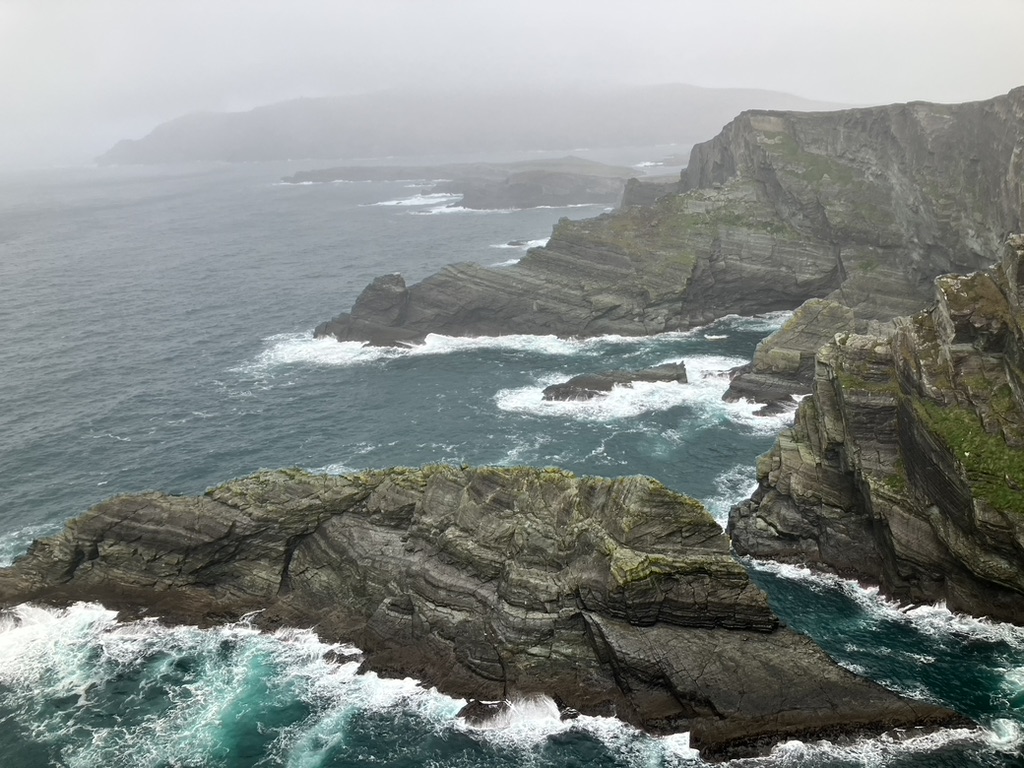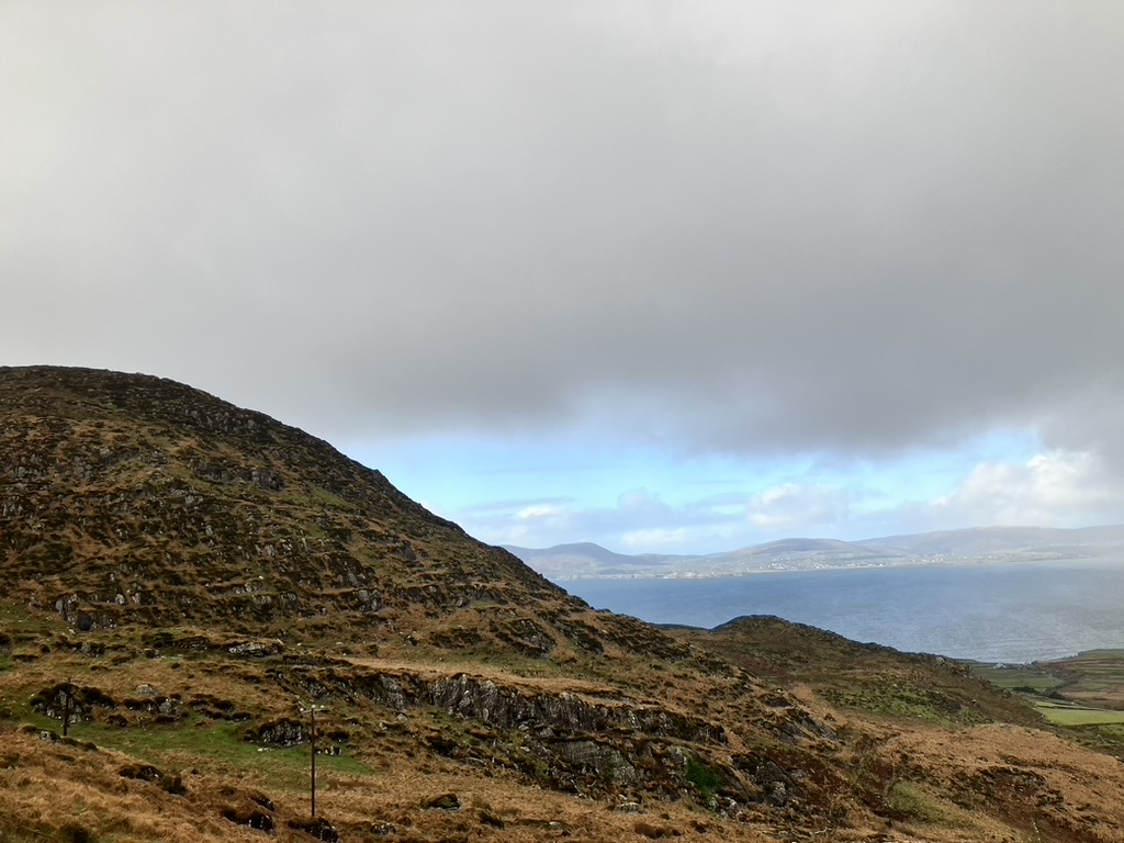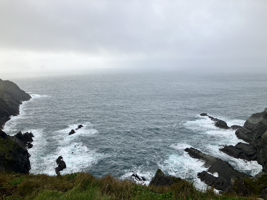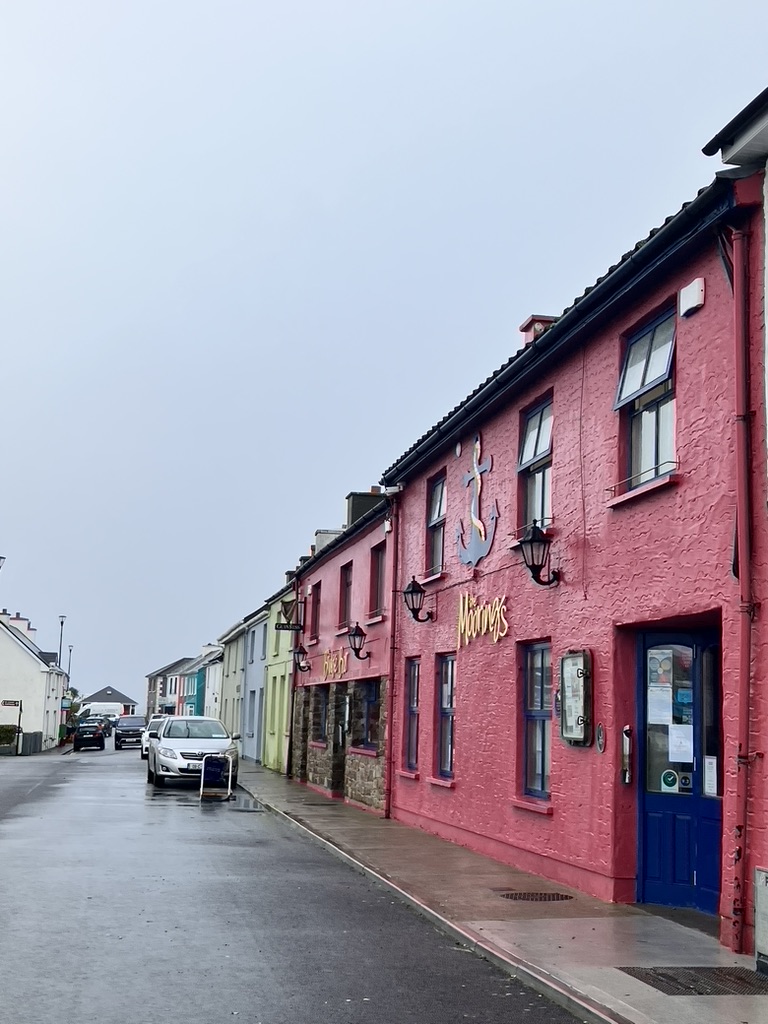Dingle: a small fishing town cropped on the southern coast at the middle of the peninsula, jutting out into the ocean lashing its fury along the Wild Atlantic Way. It has learned to love its weather, its time, and its place. The wind came in east right off the Atlantic, bringing with it mist, rain, sea sprayed cold air and low clouds. Visibility was at a minimum, and umbrellas were useless against the onslaught. Yet people did their shopping along the three main streets that inched upward along the gently sloping hill, along colorful store fronts and inviting placards; they met up with friends, equally bundled up in wool and down and dabbled on the street curbs. Friends and colleagues gathered around outdoor pub tables, oblivious to the cold and rain sneaking in sideways under awnings and conducted their socialization, holding onto their pints as usual. We found ourselves at the Dingle Pub along the narrow and rickety Main Street, which appears to be the place. Dingle and the county is in the Gaeltacht Chorca Dhuibhne, a Gaelic speaking region, where Gaelic is spoken, practiced, and learned. Into the pub poured what may have been groups of students at terms’ end; one group was hosted by what I assumed to be the teacher, and her pupils all gathered around the hub of herself. I imagined the term over, the class dismissed to the pub and the language practiced in earnest. Included though at the bar itself were of course the young couples fashionably dressed, the older men who’ve come for the daily news, and the football watchers exuding random and sudden calls of shame or glory. We sip our tea. The warmth of it and the joy in the patrons brings life to this otherwise formidable piece of land.