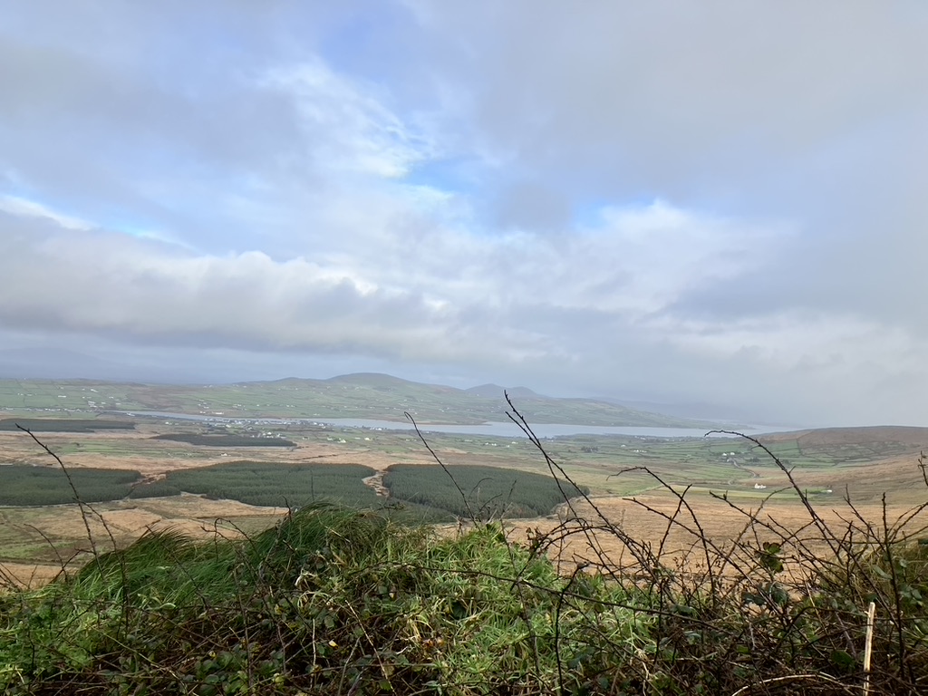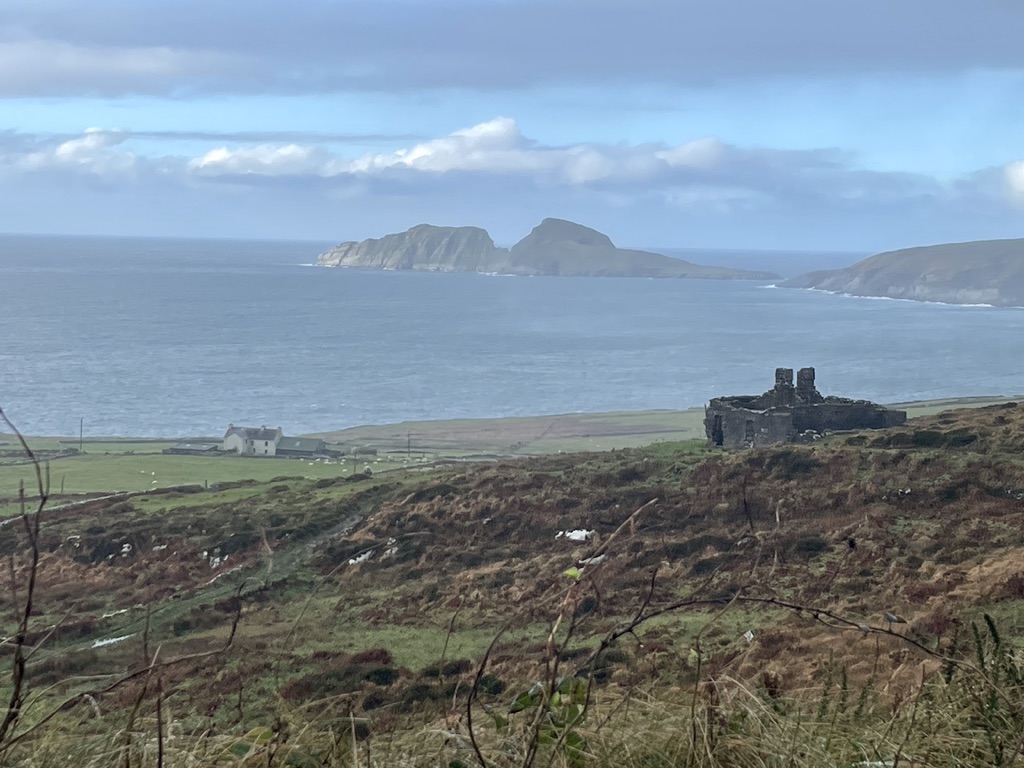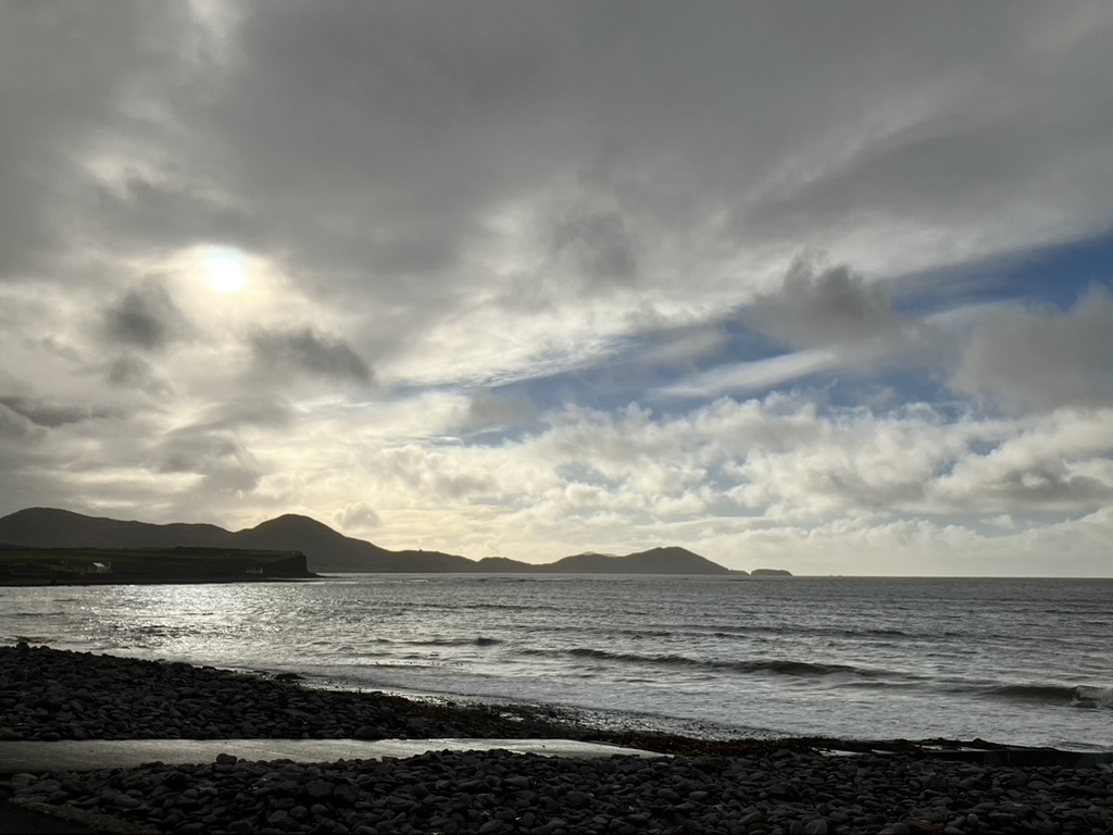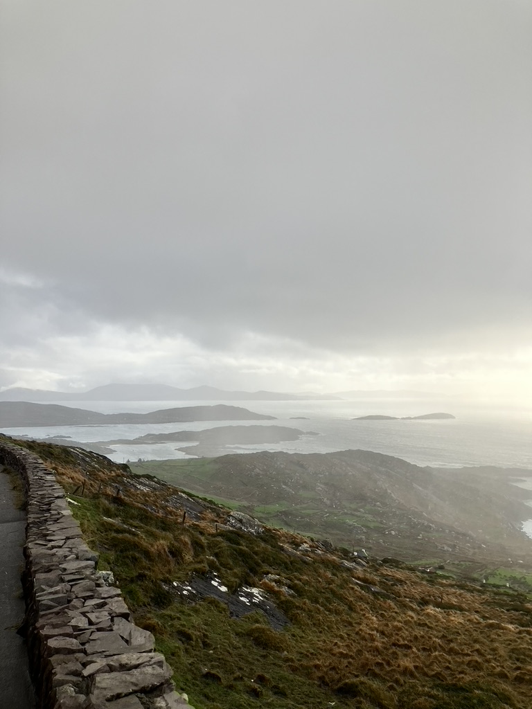Dingle: a small fishing town cropped on the southern coast at the middle of the peninsula, jutting out into the ocean lashing its fury along the Wild Atlantic Way. It has learned to love its weather, its time, and its place. The wind came in east right off the Atlantic, bringing with it mist, rain, sea sprayed cold air and low clouds. Visibility was at a minimum, and umbrellas were useless against the onslaught. Yet people did their shopping along the three main streets that inched upward along the gently sloping hill, along colorful store fronts and inviting placards; they met up with friends, equally bundled up in wool and down and dabbled on the street curbs. Friends and colleagues gathered around outdoor pub tables, oblivious to the cold and rain sneaking in sideways under awnings and conducted their socialization, holding onto their pints as usual. We found ourselves at the Dingle Pub along the narrow and rickety Main Street, which appears to be the place. Dingle and the county is in the Gaeltacht Chorca Dhuibhne, a Gaelic speaking region, where Gaelic is spoken, practiced, and learned. Into the pub poured what may have been groups of students at terms’ end; one group was hosted by what I assumed to be the teacher, and her pupils all gathered around the hub of herself. I imagined the term over, the class dismissed to the pub and the language practiced in earnest. Included though at the bar itself were of course the young couples fashionably dressed, the older men who’ve come for the daily news, and the football watchers exuding random and sudden calls of shame or glory. We sip our tea. The warmth of it and the joy in the patrons brings life to this otherwise formidable piece of land.