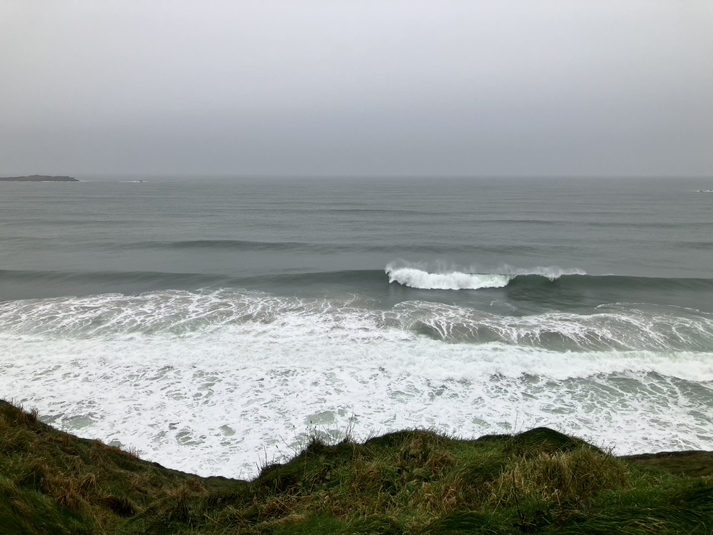 The Cliffs of Moher landmark attraction is undergoing restoration and “widenation” projects, as I call it, to accomodate the large amounts of seasonal visitors. Although on this trip relatvely few tourists have impacted our wait times or drive times; the roads have been empty and the pub tables can be snagged, there are many indications that Ireland is still a fully embodied Christmas and winter destination, as Churches are open, mass times regular, and the guitars and flutes continue to sing out from pubs where you can still snag a table for a listen. We hadn’t come across any fiddlers though, save one on a cliff at Moher. Music started early in Dublin, but it never got started in Cork, Dingle, or Killarney until 9 at the earliest. So out here was the fiddler, cold wind biting into her finger tips on the fret for the sharps and minors of Irish ballads, over the cliffs and recalling the heart of every Irish movie we’d come to love. The restoration project is an ongoing affair that had the cliff side trails closed from points both south and north from the center area. Farmland comes right up to the cliffs, and these are more sheer, cut by weathering neatly, and the water comes up to a sandy and flat shore gracefully, with ease and patience. We walked along the cliff for about a half hour; in warmer months, musicians would stake out a “pitch” – a place where they could play their instrument without it interfering with the next musician. On a previous visit, I encountered a harpist whose plucking mesmerized visitors. Music is part of the fabric here, and the wind carries it and winds it around your soul.