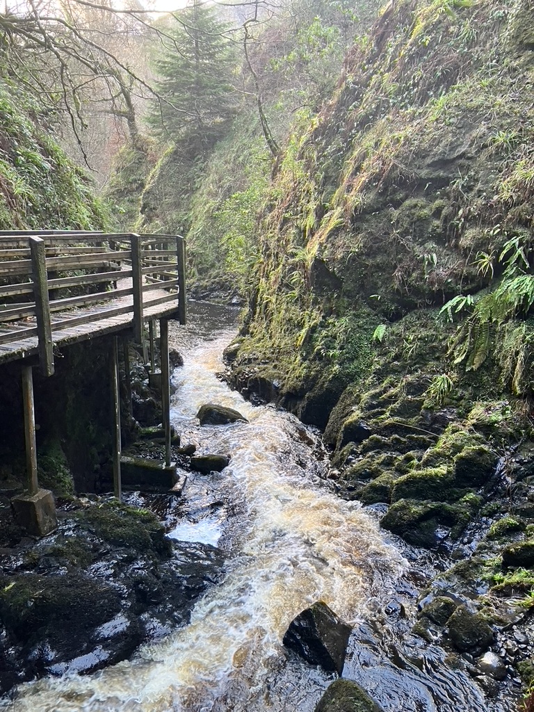 We wake the next day to the same rain, this time more severe in its pouring and wind whipping, and despite the flimsy umbrellas we bought whose purpose now seemed nominal (“Did you bring your umbrella?” Someone may ask you before a trip to Ireland. “Yes! All packed!”) decide to wait it out till 11 before driving to Blarney Castle. Once there, the rain lets up for a respite from the recent cities and into a lengthy, much needed walk through nature: wild woods and landscaped gardens, along the rivers Blarney and Martin, past farms with contented horses and cows busy with the green grass and through and up the castle, its walls and winding staircase still intact and bringing up thousands of visitors a year to the open roofed top, where, if you trust two blokes paid the state minimum wage to hold onto your legs while you dangle upside down along an exterior wall 85 feet from the ground, you can kiss a stone rinsed in centuries of people’s spit.