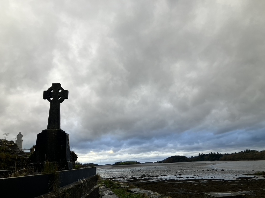 The next two days were devoted to getting acquainted with the small village of Donegal, at the mouth of Donegal Bay which narrows into the River Eske, and around which the town was built. One small triangular roundabout centralizes the three main streets that meet here, and in this triangle a Christmas tent and banner were announcing Christmas festivities; lights and wreaths hung in anticipation. Two butchers, a grocer, a few cafes with breakfast and lunch offerings, a few pubs for the evening meals and drinks. A castle, two cemeteries, one dedicated to the famine victims of 1849-1860, up the hill, the other overlooking the river, its Irish crosses and blocks of marble tilted but holding; its weathered tombstones in various stages of decay, chipped and whipped by the cold salt wash, lifting names and dates to the wind, letters and numbers sinking into the stone. We walked out of town up the hill, away from the water and onto a walking trail that fed into the heart of the county, greeting the light rain as it came with no more than a shrug and a kiss, tracking the low clouds and fog as it hung over the meadows, ruffling the thick coats of wool – ours and theirs, those wooly, oily tresses keeping the rain from dampening their day, and rainproof gear and flimsy umbrellas ours. We returned along the same tracks, stopped at the grocer, and ate warmed salmon and creamed potato casserole in the stone cottage under soft light.