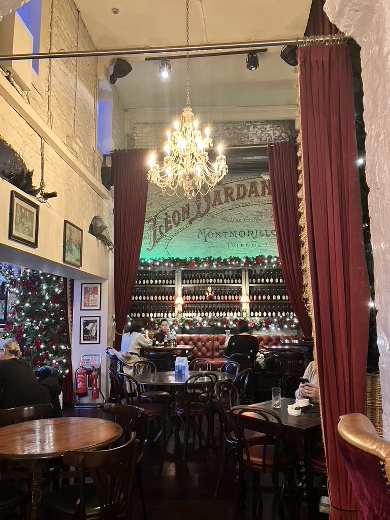 We located the apartment rental and contacted the landlord for entry information as he requested. There was a problem with the facade, how it didn’t look like the pictures he sent, and a gate that was not where it should have been, and the app through which short words and incomplete phrases of communication made understanding of a situation delayed and difficult. As it turned out, the host regretted his error and directed us to the wrong rental; ours was further west. A 15 minute walk later lead us to the correct premises and gate as indicated. We entered, found the appropriate apartment complex, the correct key pad entry, and walked in to a lovely cold apartment, whose large living room widows faced north and over the river. With heat and coffee, we settled in and spent a good few hours accessing the lost baggage site to update a new temporary address. I watched the ducks swim by on the river and the green double decker buses roll by on the quay, the chatter of engine and pedestrians on this winter weekday morning as I waited for the computer pages to load, the little circle going round and round in the palm of my hand. Once updated, we head out to Temple Bar, the historic section of Dublin now known for music, bars, and shopping.