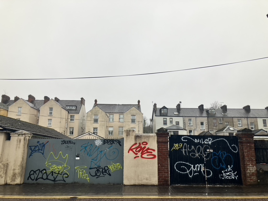 From the market we walked to St. Finbar’s cathedral, a giant landmark spearing the low hanging cloud covered skies of Cork with its belled spires, and from there along South Mall, back to the busyness of the historic district, ready for the next warm up. We happened upon Woodford Pub along a sidestreet, where we were warmly received. We were showed two seats along the wooden bar propped with draft handles of hops and ales and stouts and behind which was a mirrored wall with glass shelves of spirits. The proprietor took it upon himself to make my Irish coffee himself and told us a little bit more about Cork. It’s workers come from all over Europe; “The bartender is from Paris. There is a server from Belarus, and one from America, so as you can see,” he said, “Cork has a lot of immigrants” who go to school or work at the large Apple factory “up there.” He points behind him “How’s the coffee?” He asked me, as we both turn our gazes to the bottle of Killarny Whisky and then to my dark brown, frothy, spirited coffee. It’s one of the best I’ve had yet. “Delicious. Just right.” The conversation moved on to its other industries: manufacturing, IT, health, beer, and pharmaceuticals (not necessarily in that order). The young may stay for university, but once they graduate they tend to do what young people do: head out. We stayed and chatted a while on the upcoming election and the same issues facing Ireland as elsewhere: cost of living, immigration, affordable housing. Housing insurance, the taxes, the repairs. He and his wife have bought a place and – knocks on the wooden bartop – may be able to retire soon. He recommended a stroll through the park, a 20 minute walk west, and the History of Cork Museum located there. With new whiskey warmth, we headed out and walked through working class neighborhoods, practical, efficient, small one and two story townhomes, attached to one another as if posed for battle in a defensive line, all the way down the blocks, little in way of gardens but strong in graffiti artwork scrolled along the low cement boundary walls that kept them apart from the sidewalks. The green of the park announced itself as promised, and finding a shelter from the wet and surrounded in the aromas of soil and the greens of the still fresh grass, lush bushes and full trees, split the fish and cream pie with chilled wet fingers.