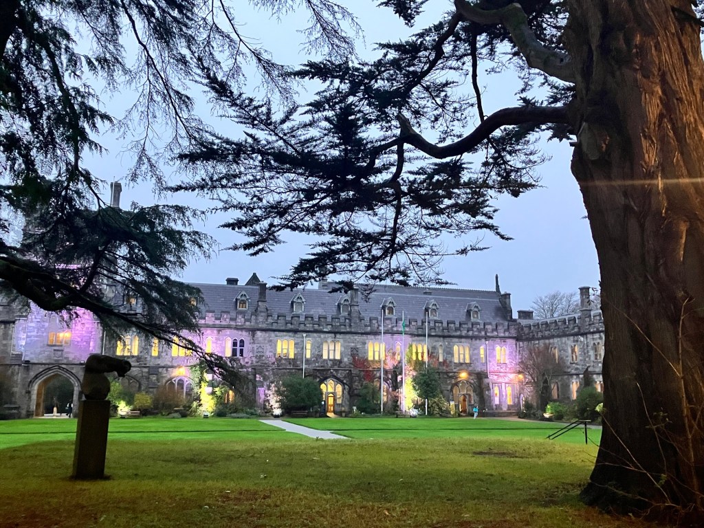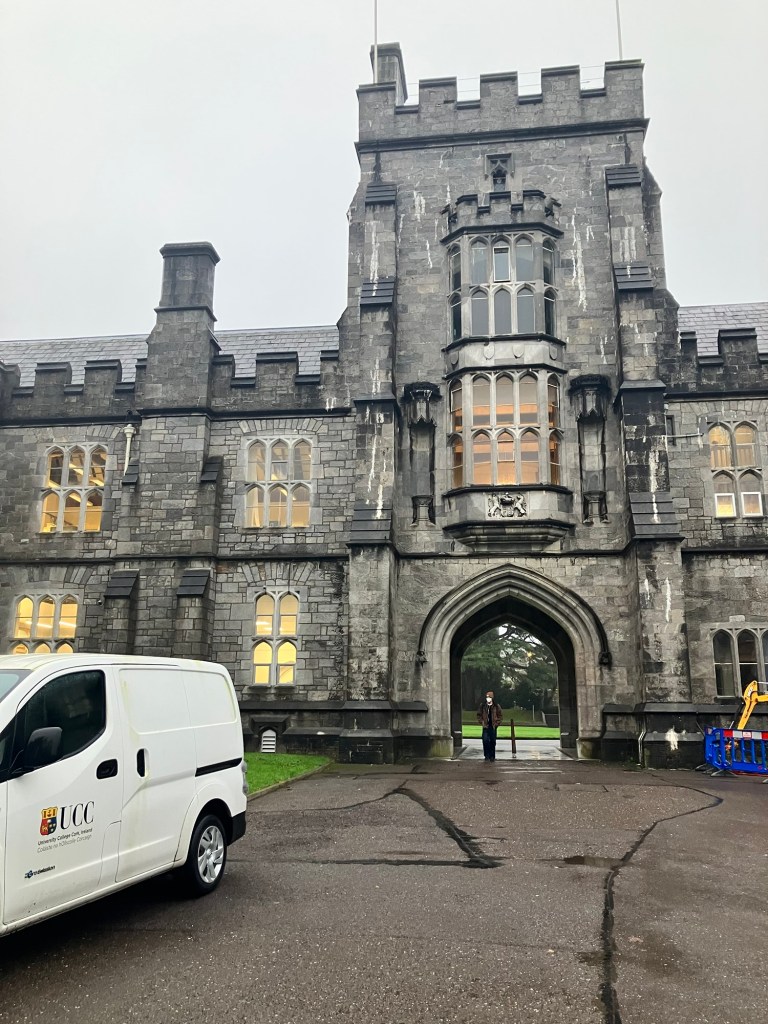 We had the museum to ourselves. Perusing the descriptions and artifacts, we learned that Cork was the hub in Ireland for silver, glass, and wool production, creating and exporting fine tableware and woven fabrics and cloth for homes throughout Europe until larger corporations and industries took over elsewhere. Shipping industries and manufacturing were dominantly portrayed in ledgers and photographs. and I was left with the impression that Cork gave itself a place and name through manufacturing, and still does today but with different products. Not to say the University College Cork hasn’t attracted a vibrant student body, as a later walk through its neo-gothic campus attested. Green landscape lights accented the turrets and arches, lit up the limestone facades; on the opposite side of the grassy quad, the student study areas were bustling with activity and the cafeteria, the library, and halls all buzzed with an energy of things being learned and studied; even the chapel had its door open, the nave lit up and a daily mass schedule posted; again, a more parochial feel than Trinity or University College Dublin but holding its own merits with the past and future echoes of significant writers and scientists. Along the breezeways, ancient stone slabs line the breezeways, chiseled with information in horizontal and vertical lines, from the ancient Irish language Ogam.