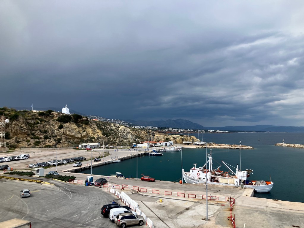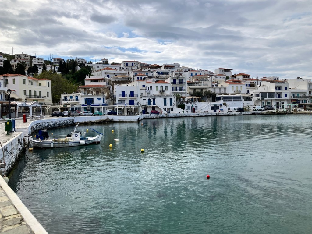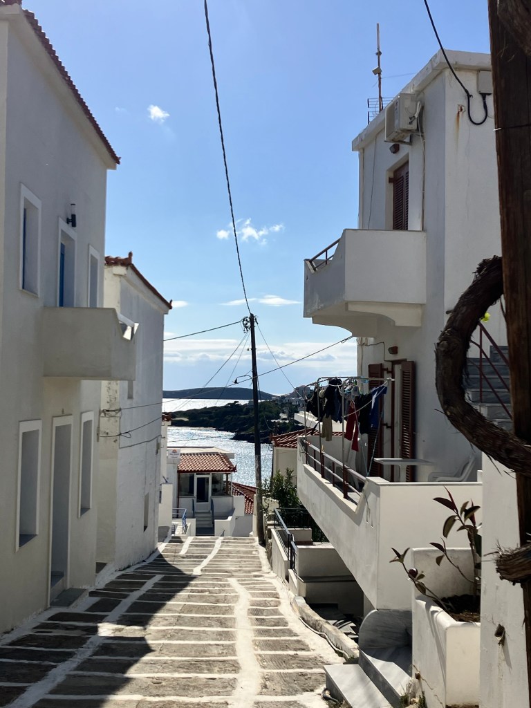 I’m looking out the rain splattered window of the ferry that is now delaying its departure from Rafina port, on the east coast of Athens. Suddenly, four or five men run down the cement wharf to an area next to the us with sledge hammers and begin to pound on and upend chunks of cement with such vigor it was likely a pipe had burst and was spewing unsavory contents into the sea. Within minutes, a sizable hole had been dug and several of the men knelt down and peered inside while others stood back, in what looked to be a thoughtful, deep huddle. Then they ran back and forth to our side of the cement peer, to where the mouth of the pipe opened to the water. The woman opposite me, who earlier insisted I share her bag of chips and peanuts, soon gets word and explains to me that a dog fell into one of the pipes. The poor animal had no idea of how much attention it had drawn, as even a fisherman in a small fishing boat bobbing up and down by the exit point, held its course while he tried to coax the lost dog out into an even scarier sea. Soon a new orange vested official arrived on the scene with a life buoy and rope. All of them now held some kind of conference there in the rain, assessing the situation. By that time though, the ferry was pulling away from the dock and I was on my way to Andros.