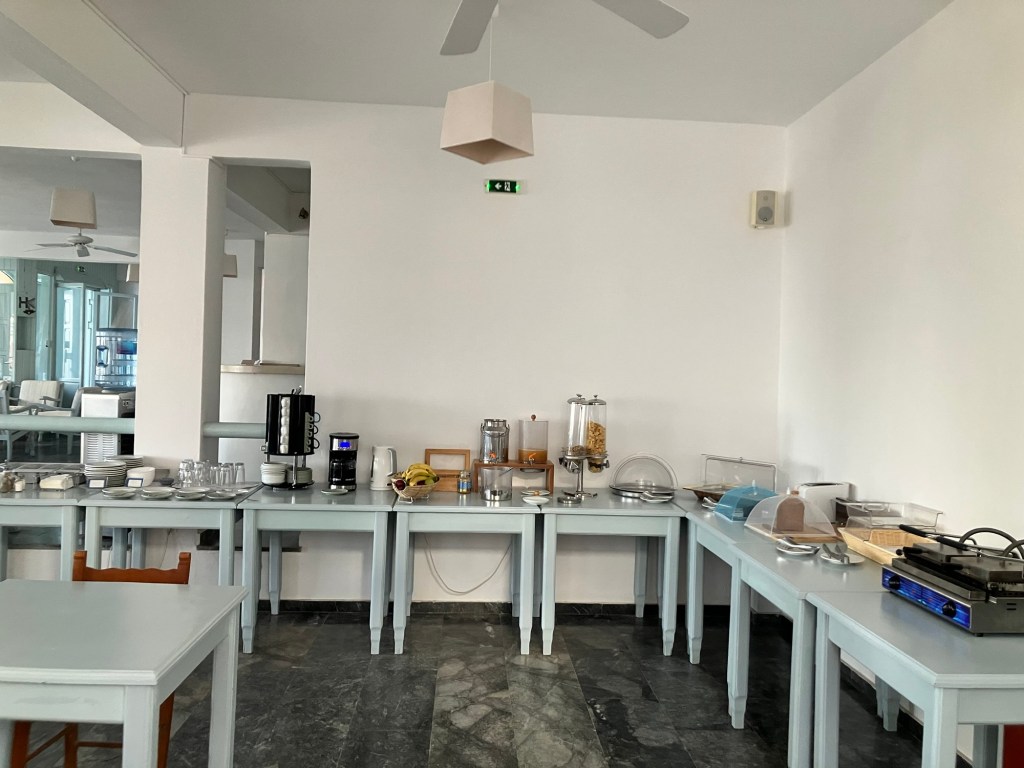 I meet Julia the next morning as I went out to the kitchen in search of coffee. Originally from Ukraine, she’s been in Greece for 15 years and works here as the cleaning maid. She is the only non English speaking person I have met in Greece, so we start speaking in charades. Blond haired, blue eyed, mid thirties I imagine, she buzzes around the place with quick choreographed movements. She unfurls the tablecloths draped over the trays and dispensers waiting for cold cuts and cereals. I gesture to help. “No, no, you sit, drink coffee.” A series of gestures follows to indicate her job and my job, and that D, “her boss” would “have her ass” (here, she points to her bottom and starts spanking it) if she were to relinquish her job to me. I’m not sure she knows exactly who I am, but to her my job requires me to relax and drink my coffee. “Breakfast at nine. Eleni sleep, Eleni drink kaffee.” (Here she places both palms together as if in prayer and lays the side of her face onto them.) I acquiesce, sit at one of the tables, and take mental notes. She plugs in the coffee machine which begins to gurgle and and drip while she takes sliced deli cheese and ham, tomatoes, red peppers, and feta cheese out from one of two refrigerators behind the swinging door. She grabs ice packs from a freezer and puts them under the serving trays. She goes back to the kitchen for the fun flavored corn-based cereal and granola, none looking extraordinarily healthy, with which she tops off the dispensers, then runs back to the kitchen to get the milk and orange flavored juice that looks more sugar than orange and pours those into canisters. Simple and cost effective for the mass of people that have yet to show up but are promised to. The bread selection would make a baker cry, but the few guests who show up later seem to love the stuff, layering ham and cheese between the precut white slices and smashing the whole thing between two hot griddles into a panini. Finally, though, on the other end: lemon jam, tahini, and honey selections sitting in mason jars next to a large dollop of Greek yogurt; next to them, a basket of apples, pears and bananas sit, waiting with the glum realization that they are probably a guest’s last choice and serve solely as decor. Feeling somewhat superfluous, I retreat to my room with my coffee.