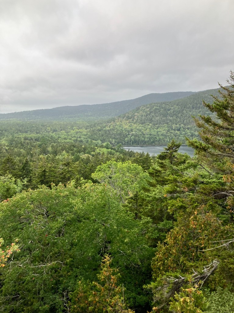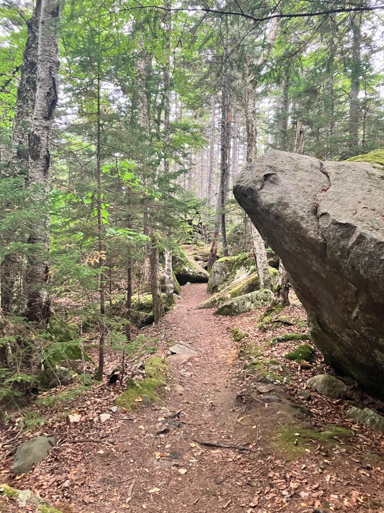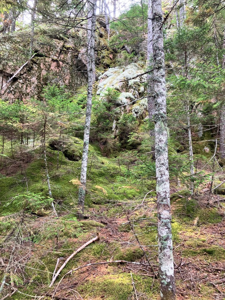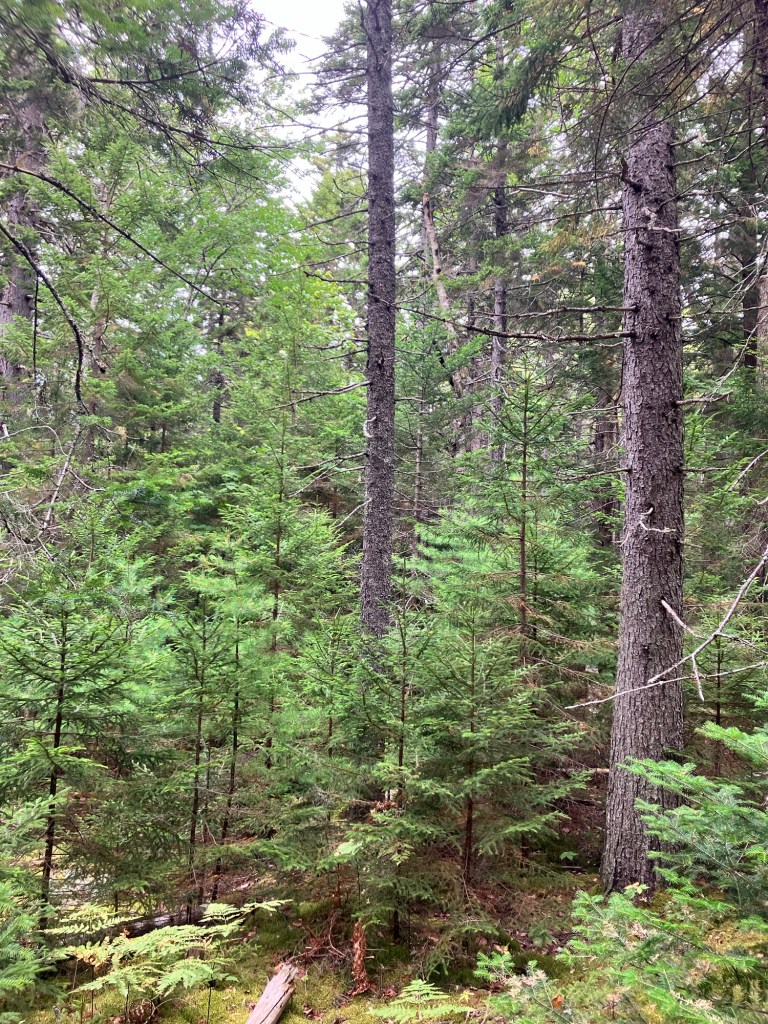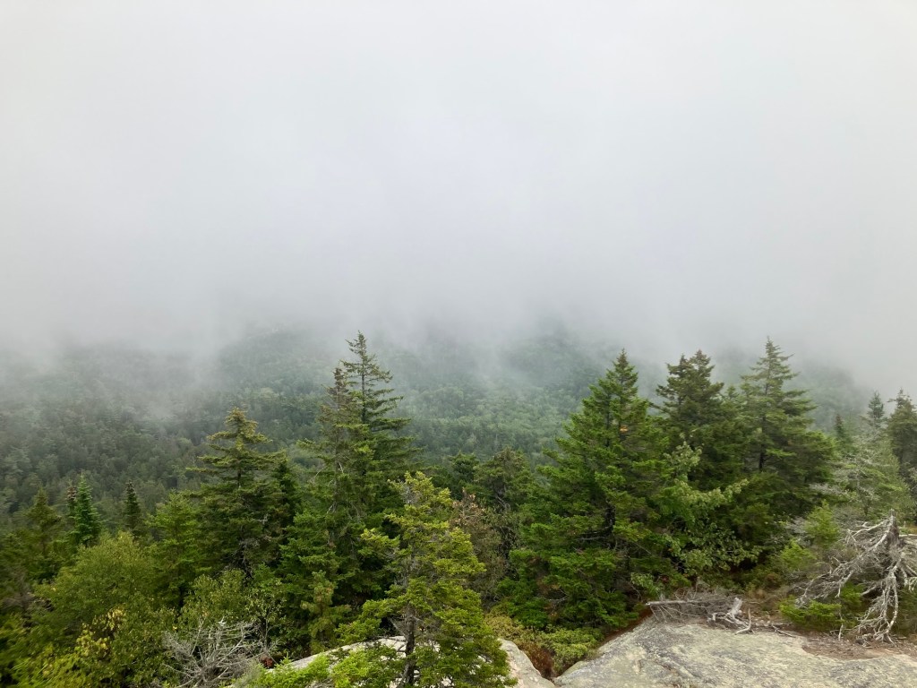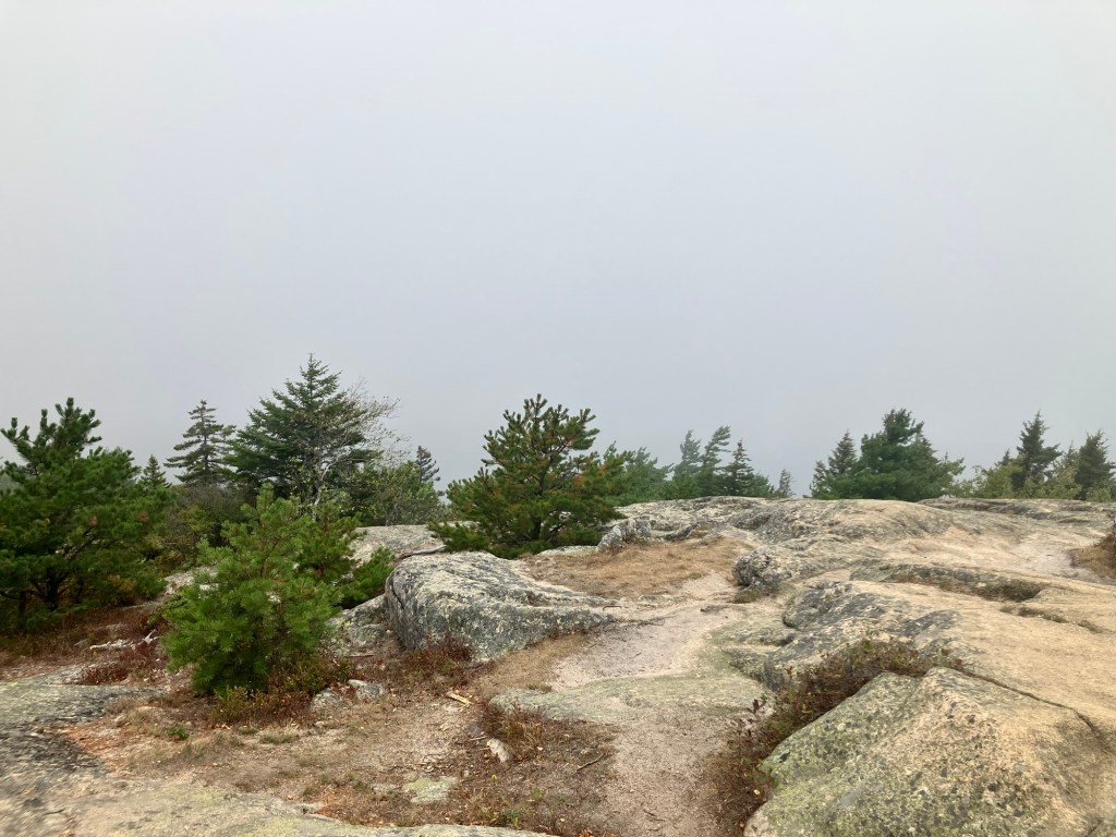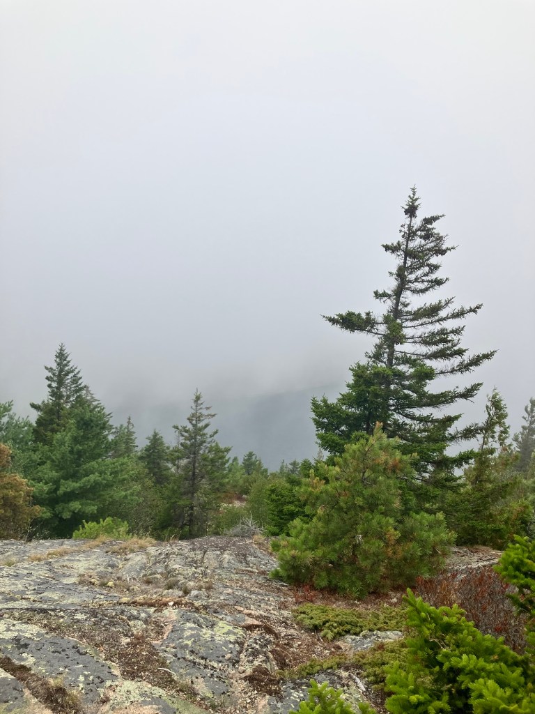 We parked the car on the northern trail head to Beech Mountain. Each hike is different, each woods has something else to say, each trail offers insight and challenge to each thought and muscle. Young growth crops up everywhere around us. Soft, light green needles shoot out from trunks still capable of molding to climate and time. Wispy hemlock, sturdy fir, aromatic pine, ranging in height from a few feet to soaring points all share the slopes. Scaffolds of these new generations offer a place to return to for our own next generations. With such fortitude they exist and survive! Crevices in sedentary rock provide only the bare minimum in mineral and water access, yet roots take hold and together they stand the time. The ground cover gives somewhat under foot, creating a soft sponge tread; sea and moist air layers the decomposed maple and birch leaves soon covered by more of their kind as this season’s leaves will fall. The ascent is gradual up to Beech Mountain, big boulders of granite and layered metamorphic cliffs line the way, and soon, a few miles later, the summit announces itself by a flattened area of rock. Today though, no other indication hints that you’ve reached the destination because by that time, the fog has come in from the Atlantic, and it surrounds you. Its ethereal mist, obscuring familiarity and direction, loosens your grip on place. Steadiness wavers. Coordinates you’ve come to rely on, like distance and depth perception are absent. Suddenly, self-reliance is all you’ve got left in this opaque mist that dares you to fear. After all, it’s been a while.