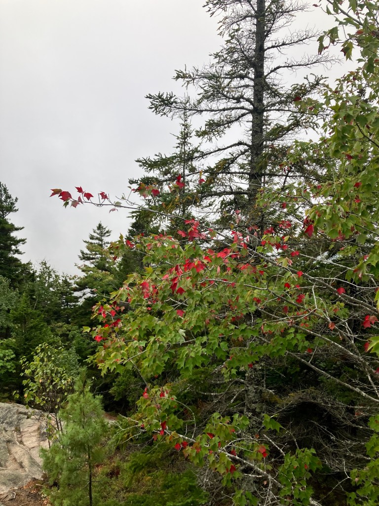 The destination is Acadia National Park, in Maine, and as my partner and I take the drive north on I95 from Boston shortly after Labor Day, we’re met with changeable weather that culminates in heavy clouds and light rain. Cooler air found its way up our unprepared sleeves and unzipped jackets, and already by three in the afternoon the cars’ headlights lit the way around low hills and through deciduous green banks on the brink of breaking into crimson and gold. Some young trees couldn’t resist: they plumed a splash that bled across the hills foreshadowing the imminent. But until then, the deciduous leaves that flower in full shades of green all summer brilliantly mask their brighter pigments. I’ve since understood that it’s the green chlorophyll fed fatly by the long hot summer sun that keeps its colors hidden. Today I see only a collective green forest which will quickly break down from the upcoming change in climate and light.