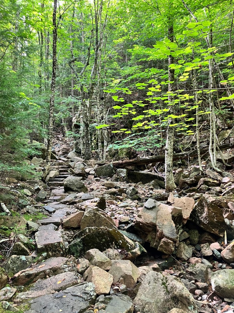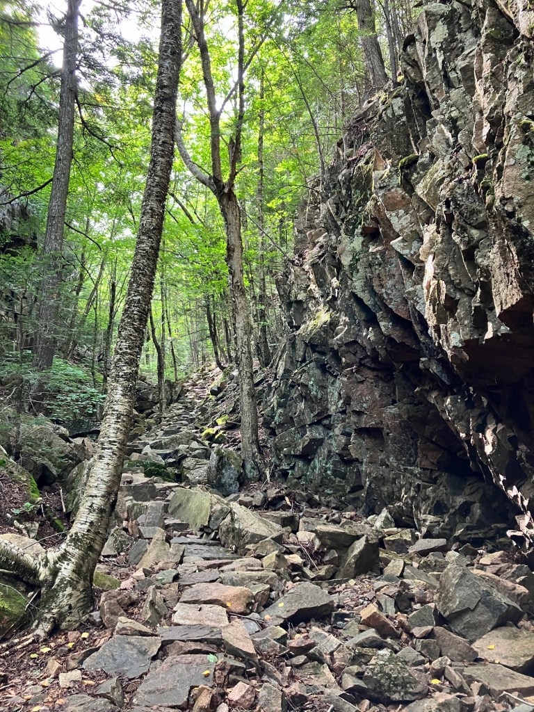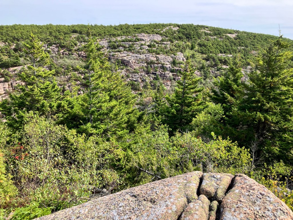 Once Bar Harbor has satiated a stomach or adventurous agenda, there’s a whole park to explore. Cadillac Mountain, the highest natural mountain on the eastern sea board at roughly 1500 feet, is the most frequented attraction. Options to access it are available from the north or south ends via hiking trails or by driving to the summit (an option by reservation only from April to October). We reached its summit by hiking 4.7 km in from the north, along the rocky, challenging Gorge Trail that serves in wetter seasons as a drainage for melted snow. We scrabbled up the rocks that form the path, sometimes needing to use both feet and hands for grip and stability. Steep, layered bedrock lines the ravine, the sun glitters off the leaves, the air becomes remarkably cooler. The autumnal plunge begins.